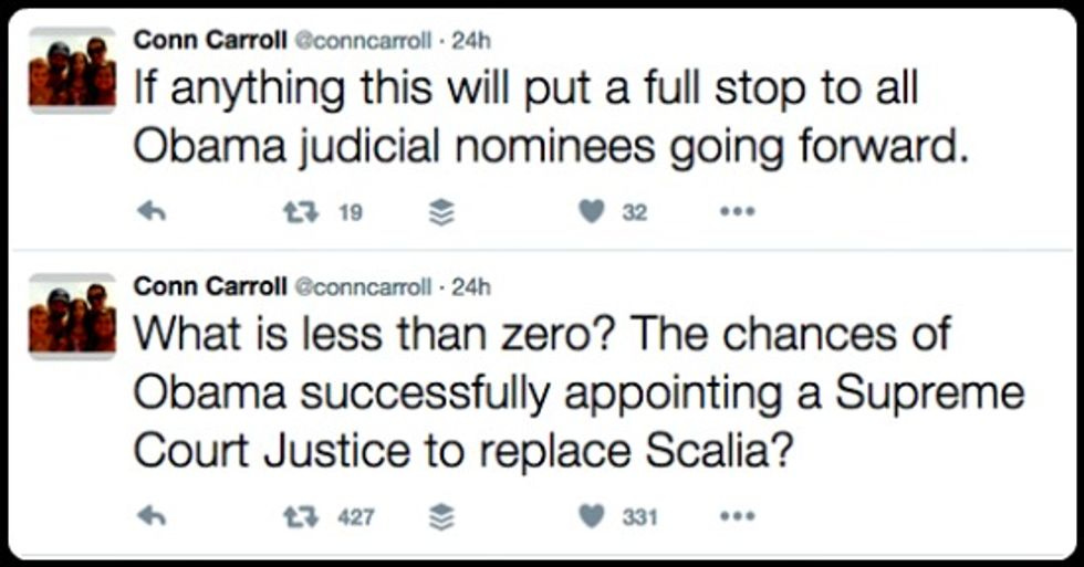 After Antonin Scalia shocked the world by abruptly dying in his sleep some time Friday night, your namby-pamby liberal Twitter feeds and Gchats and your texts and probably your Tinder messages exploded with a mixture of (1) "Good. Fuck that guy." (2) "HOLY CRAP WHAT ABOUT [pick whichever SCOTUS case you were most worried about this term]." (3) "I feel sorry for Notorious RBG, because she did love him dearly." If you were a conservative jackhole, however, and you happened to work for, say, conservative jackhole Sen. Mike Lee, you probably rushed to your keyboard to pound out a chest-thumping demand that the Senate simply refuse to engage in its constitutional duty of advice and consent.