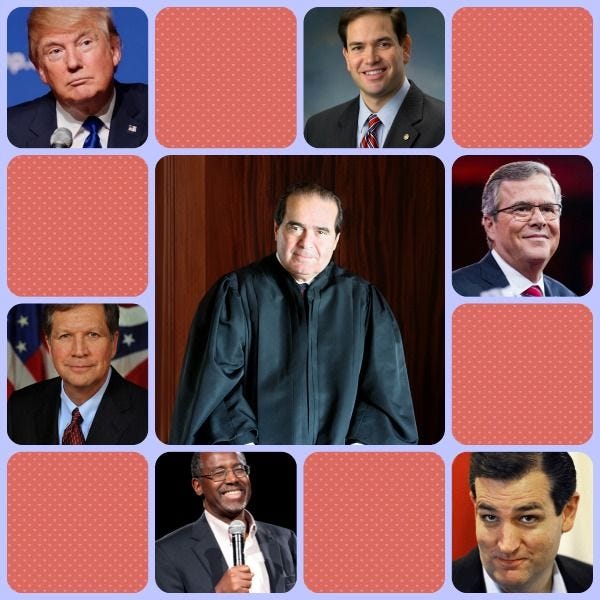 Because God hates or loves us -- we can't tell which, most days -- there was of course a GOP debate already scheduled for just a few hours after the news hit. This gave us an opportunity to see six GOPers, all of whom are constitutional legends in their own minds, develop new and interesting theories about the Supreme Court nomination process. John Kasich, the theoretically most reasonable one in the race, declared that President Obama shouldn't appoint anyone unless he can appoint someone universally beloved by Republicans, basically.