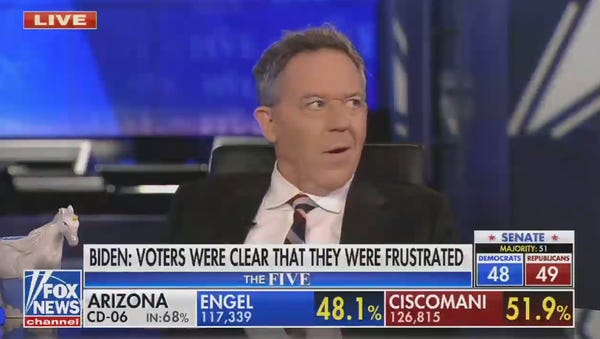 Watch Greg Gutfeld, who gets to be the "king of late night" because septuagenarian white racists pass out in their box wine during Laura Ingraham and leave the TV on, as he slouches like a frumpy teenager in his chair — he is pushing 60 — and bitches and moans that normal Americans aren't anti-abortion white extremists.