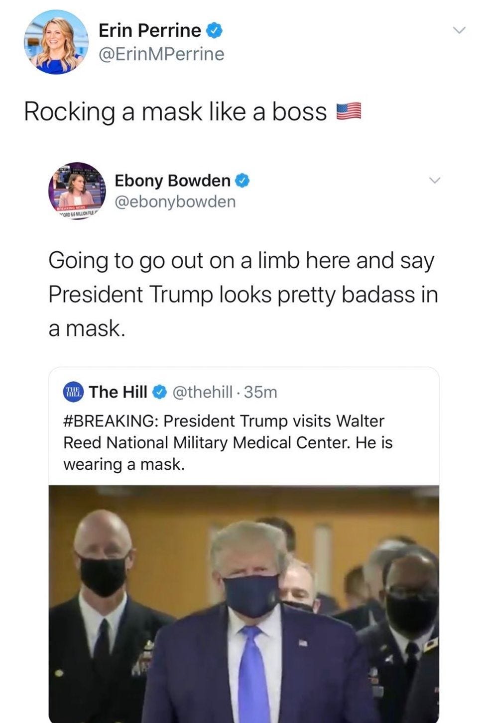 Biden has publicly worn a mask for months. He's not Little Richard. Trump can't just copy his style and declare himself a trailblazer. Ebony Bowden, a putative journalist, claimed the president “looks pretty badass in a mask." That's not the point. We're not debating the aesthetic merits of masks as a fashion accessory. Trump's deputy communications director, Erin Perrine, replied to Bowden's tweet and boasted that Trump rocked a “mask like boss." Sweet Christ. It's like they're parents who are happy that their child slept in his own bed all night like a “big boy."