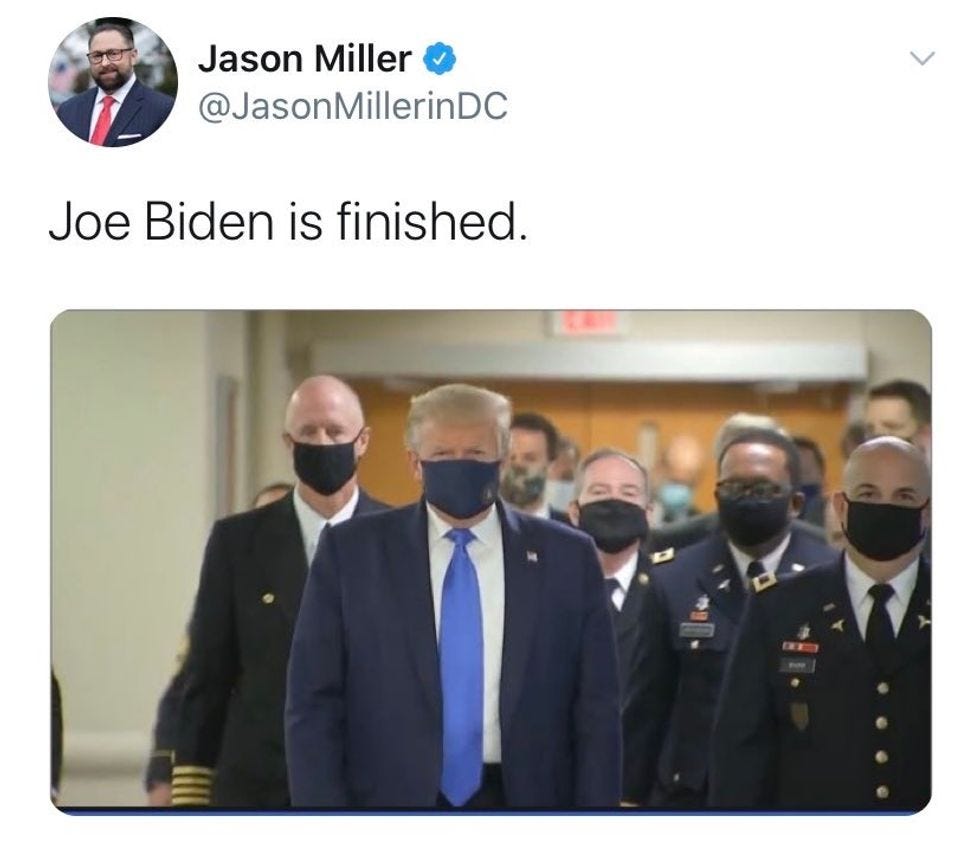 Trump's fans are now celebrating him as a real American hero the likes we haven't seen since the Lone Ranger. His 2016 campaign sycophant Jason Miller declared that Biden can't possibly win against a president who now almost, sort of acknowledges that COVID-19 exists.