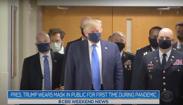 The president's reckless defiance regarding masks has caused a great deal of damage already and is arguably directly related to the dumb ass culture war around wearing them. But his advisers reportedly “pleaded" with Trump to “set an example" for the people stupid enough to still support him. I don't know how they managed it. They might've showed him the latest swing state pollsor maybe they put peanut butter inside the mask like how the producers of "Mr. Ed" got the horse to “talk."