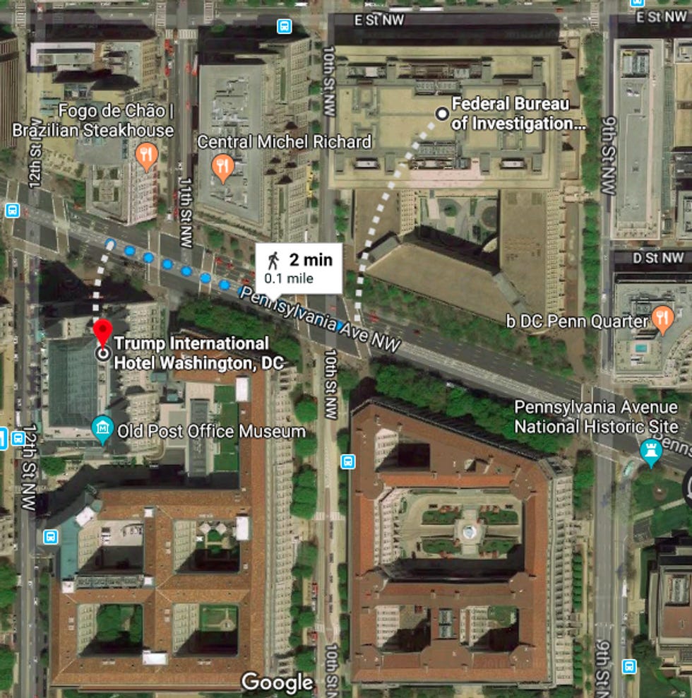 But why would she do that? Well, it's hard to say. But it definitely has nothing to do with the fact that Donald Trump's DC hotel is a block from the current FBI building.