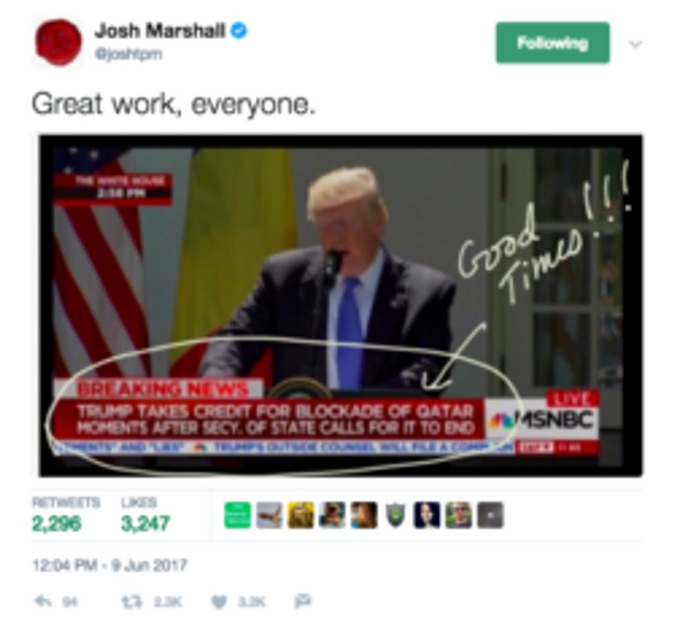 </p><p>[<a href="http: //www.economist.com/news/middle-east-and-africa/21723018-kingdom-raising-tensions-its-immediate-neighbours-well-iran?fsrc=scn/tw/te/bl/ed/saudiarabiacutsoffqatar" rel="noopener noreferrer" target="_blank">The Economist</a> / <a href="https://www.nytimes.com/2017/06/09/world/middleeast/rex-tillerson-calls-for-calm-in-middle-east-standoff-with-qatar.html?smprod=nytcore-iphone&smid=nytcore-iphone-share&_r=0" rel="noopener noreferrer" target="_blank">NYTimes</a> / <a href="https://www.washingtonpost.com/opinions/trump-didnt-know-the-middle-east-could-be-so-complicated/2017/06/08/d29bf7d8-4c8b-11e7-a186-60c031eab644_story.html?utm_term=.20f8f03a0702" rel="noopener noreferrer" target="_blank">WaPo</a> / <a href="https://www.bloomberg.com/politics/articles/2017-06-09/trump-says-he-backed-saudi-led-diplomatic-isolation-of-qatar" rel="noopener noreferrer" target="_blank">Bloomberg</a> / <a href="http://www.aljazeera.com/news/2017/06/rex-tillerson-urges-easing-blockade-qatar-170609175257950.html" rel="noopener noreferrer" target="_blank">Al Jazeera</a> / <a href="http://foreignpolicy.com/2017/06/07/did-russian-hackers-create-qatars-diplomatic-disaster/" rel="noopener noreferrer" target="_blank">Foreign Policy</a>] </p><p><strong>Happy Weekend, Wonkers! Don't forget to <a href="https://wonkette.substack.com/p/clever-title-for-donations-page" rel="noopener noreferrer" target="_blank">put something in the kitty</a> before getting outside to enjoy this beautiful day!</strong></p>