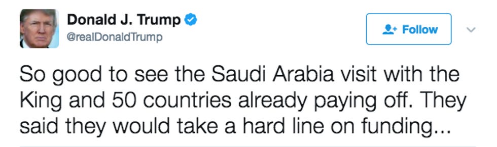 Say what you will about the Saudis, but those guys can spot a patsy! So they invited Donald Trump to Riyadh last month, put his face up in lights, let him touch the glowing orb, and even rubbed his distended belly. PROBABLY.