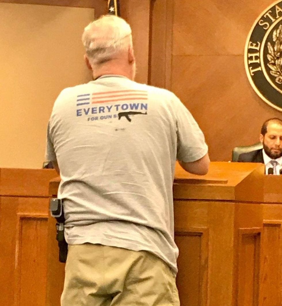 At the Texas legislature Wednesday, open-carry advocate CJ Grisham showed up to testify (on what bill, we have no idea) with a handgun strapped to his waist, as one does. Moms Demand Action founder Shannon Watts documented the perfectly well-adjusted human being's appearance on the Twitters. Look at Grisham's very funny trollwear!