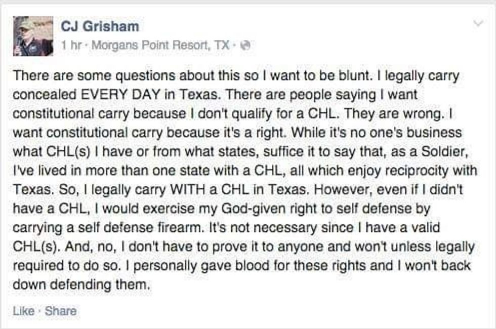 Grisham is a familiar figure on the Texas pro-gun scene, because internet trolling and activism are pretty much the same thing. He's been arrested several times, so he actually doesn't qualify for a Texas concealed carry permit, but as Watts points out , NO PROBLEM, because Texas also allows concealed carry for anyone with a permit from another state -- no matter how lax those other states' permit rules are. Hooray! As she says, that should make the NRA's dream of national concealed-carry reciprocity just the nicest thing ever, because then even states with stringent qualifications would have to honor permits from states that simply require people to be able to fill out the application form with their own names.
