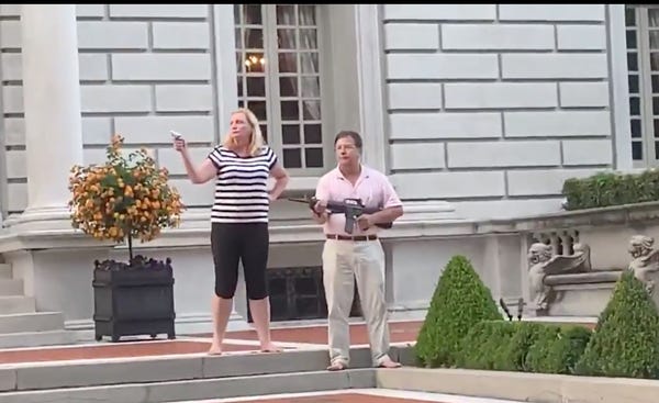 Things aren't going so well on the private street where Mark and Patricia McCloskey live. The gun-toting St. Louis, Missouri, couple were charged this summer with unlawful waving of a penis substitute, and although Republican Gov. Mike Parson promises to pardon the McCloskeys if they're convicted, most people still think they suck.