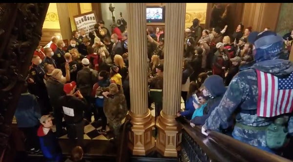 Armed protesters also turned up at the capitol because that's what white guys do when they aren't afraid of their asses getting shot. Police allowed several hundred loons, many of them unmasked, inside the building. They tried to gain access to the House floor while chanting, “Let us in!" Michigan law is a little weird in this area: Signs and banners aren't allowed in the capitol because they might damage the architecture, but protesters can openly carry in the building. I don't think bullets are great for the preservation of Victorian pilasters and the wood wainscot.