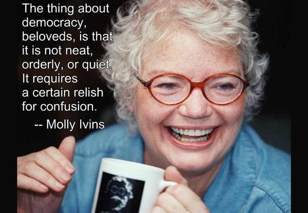 Molly was so powerful when she spoke truth to power. I used to love to read her writing. I am saving this email as an index to priceless Molly quotes. As a Texas progressive Democrat I continue to miss her sharp commentary.