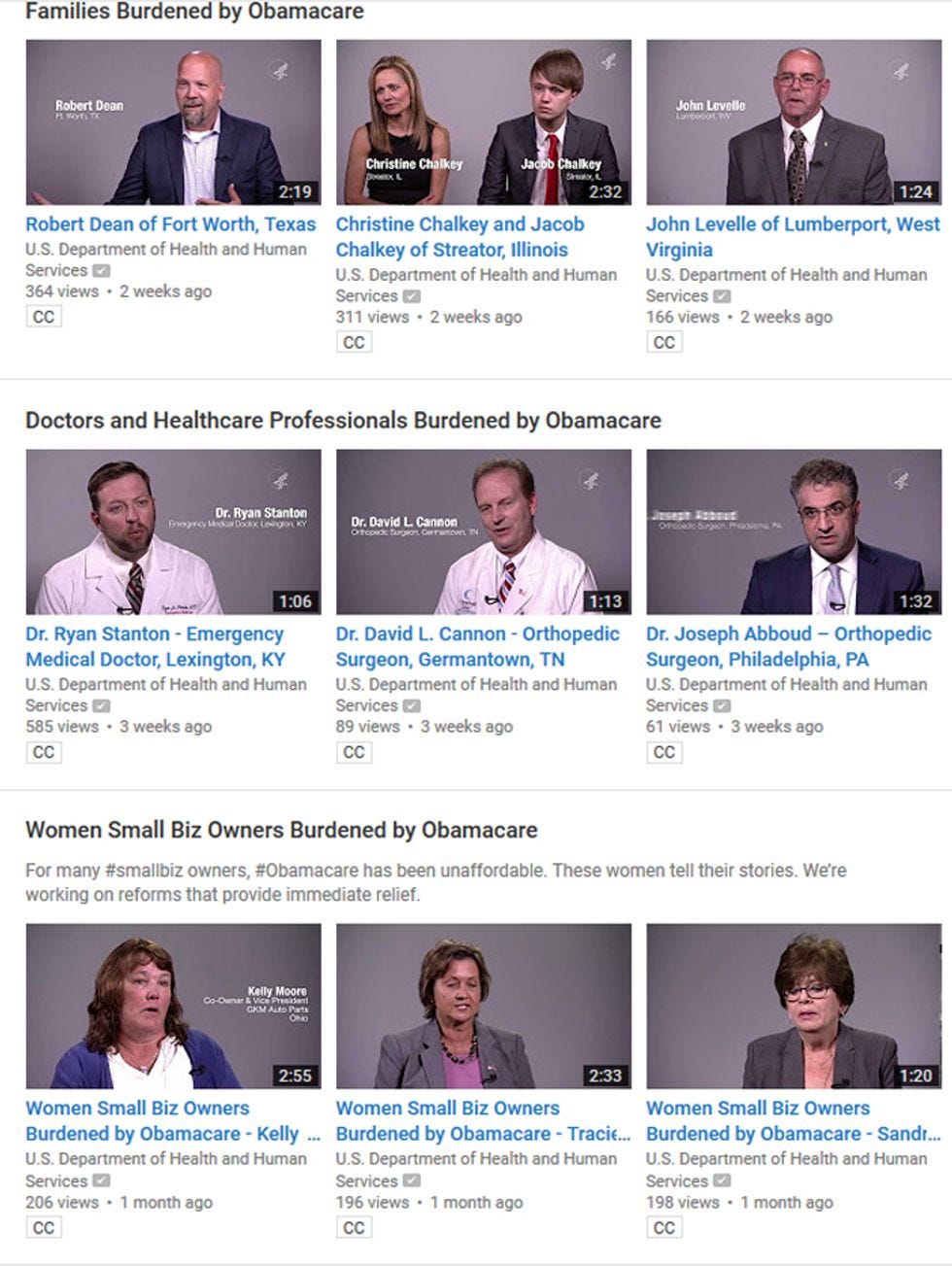 For instance, a portion of the budget for the Department of Health and Human Services is dedicated to producing ads encouraging people to sign up for the ACA during open enrollment, informing people of the benefits, and so on. Under new HHS secretary Tom Price, who's excited at the prospect of repealing the ACA, those funds are going to the creation of videos arguing the ACA has harmed ordinary Americans' healthcare. There's a whole bunch of them prominently displayed at the HHS Youtube site (autoplay video at link):
