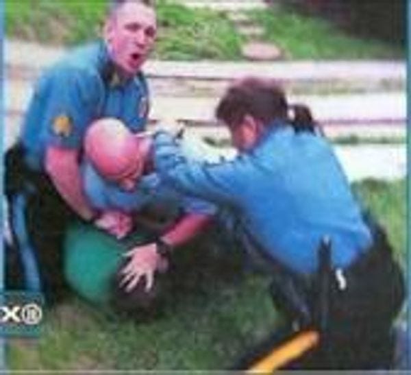 Tasca described what we see on the videotape: "The Ridgefield Park officer automatically charges and takes him down to the ground. I was quite shocked. As he's doing that, another Ridgefield Park officer flies to the scene in his car, jumps out and starts punching him in the head."