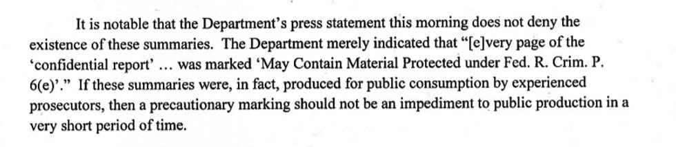 If these summaries were, in fact, produced for public consumption by experienced prosecutors [AND THEY FUCKING WERE - Ed. ], then a precautionary marking should not be an impediment to public production in a very short period of time.