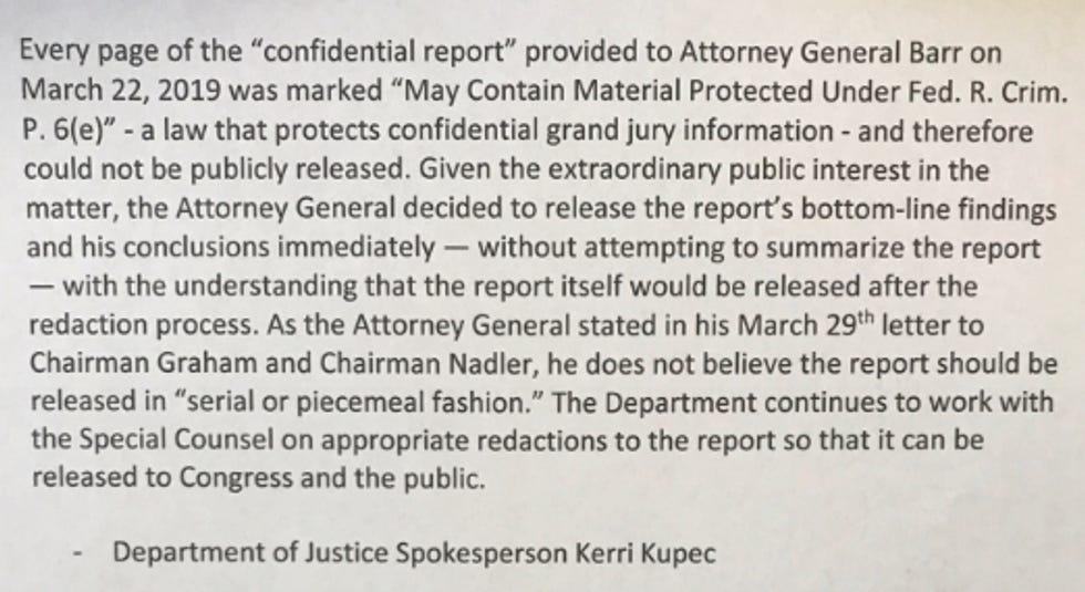 OK! The top line news there, at least according to DoJ spokesperson Kerri Kupec, is that LITERALLY EVERY PAGE of Mueller's report has a "6(e)" marking, which means it may have grand jury information on it. And they are working with Bob Mueller to make sure the redactions get done good and nice-like, as Barr has explained from the beginning, so STOP BOTHERING US WHILE WE ARE TRYING TO DO A COVER-UP! (She didn't say that last part. It is implied.)