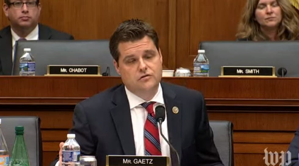 2: 10:The longest fucking hearing in history is back on! Rep. Matt Gaetz, who may actually be stupider than Louie Gohmert, is asking questions about whether Jeff Sessions is too good of a buddy to Deputy Attorney General Rod Rosenstein or something. We're sure it is a very important line of questioning.