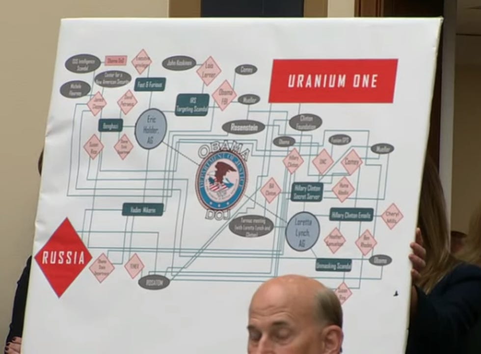 See? That right there is Louie Gohmert's chart. In the middle is Obama, and also there is Uranium One and Russia and a bunch of Obama adminstration names, and the lines between all of them were drawn by extracting Trump's jizz from Sean Hannity's mouth (ALLEGEDLY), adding food coloring to it, then putting it inside a magic marker, for chart-drawing purposes. IT IS JUST SO OBVIOUS.