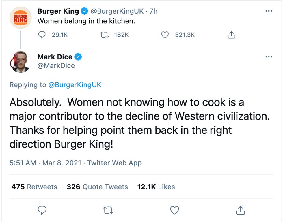If you've paid attention to social media at all today, you've probably heard about the no good very bad Burger King tweet thread, in which they tweeted the obviously controversial sentiment that "Women belong in the kitchen" and then followed that up with "Of fancy restaurants! Because not enough women are chefs!" Get it?