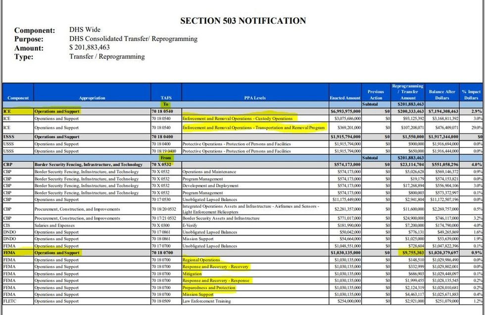 A spreadsheet posted to Twitter by Merkley shows funds being transferred from areas like "Preparedness and Protection," "Mission Support," and "Response and Recovery," which sound on paper at least as if they might be kind of useful.