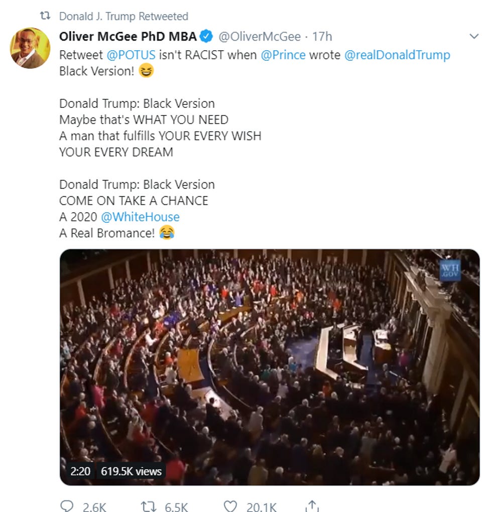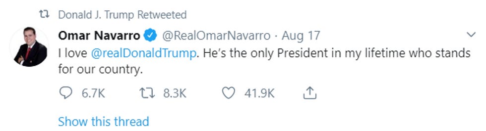 Why yes, that IS crazy ass Omar Navarro, the perennial candidate who runs against Maxine Waters all the time, who most recently showed up on Wonkette in a story about how he maybe hired Jacob Wohl to torment and harass his ex-girlfriend, who has a restraining order against him. Donald Trump only retweets the best people, after all.