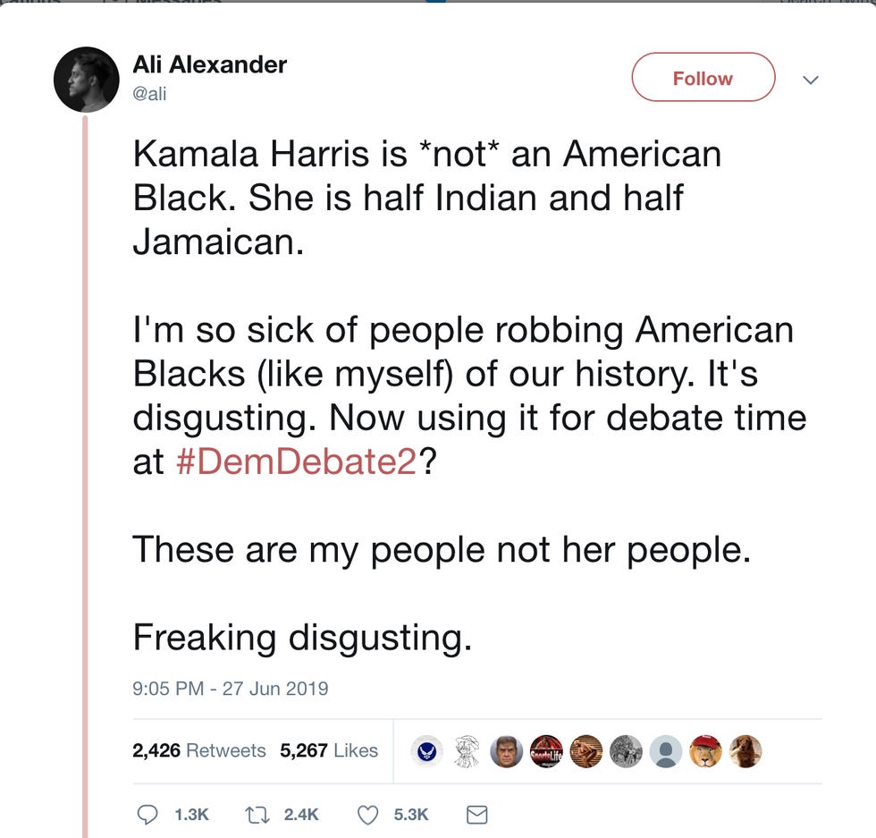 It all started when alt-right conspiracy theorist and convicted felon (for credit card fraud and theft) Ali Alexander — formerly known as Ali Akbar/Ali Abdul Razaq Akbar — put out a tweet claiming that because Harris is half-Indian and half-Jamaican, that she is not a "real" black person.