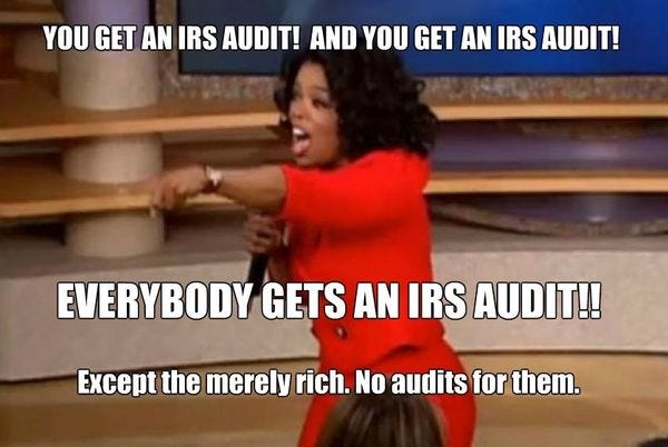 Now that we know Donald Trump only paid $750 in income taxes each of his first two years in office (I brain-farted and typed "terms" at first, so if democracy is abolished, blame me!), it's worth noting that he's got plenty of company. According to IRS data analyzed by David Cay Johnston, the financial journalist who has so much fun skewering Trump on MSNBC, hardly any of the richest Americans need to worry about ever facing an IRS audit.