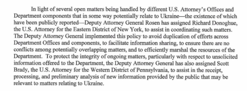 To protect the integrity of ongoing matters, particularly with respect to unsolicited information offered to the Department, the Deputy Attorney General has also assigned Scott Brady, the U.S. Attorney for the Western District of Pennsylvania, to assist in the receipt, processing, and preliminary analysis of new information provided by the public [ lol "public" — Ed.] that may be relevant to matters relating to Ukraine.