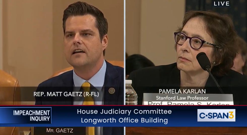 10: 52:After another stupid distraction move from Republicans, the next witness, Pamela Karlan, gives her opening statement. She begins by telling Doug Collins he is an insulting fucking idiot, because he implied that these witnesses didn't even read the facts of this case. She read EVERY TESTIMONY, you shitmouthed redneck, and wow, this lady is fire!