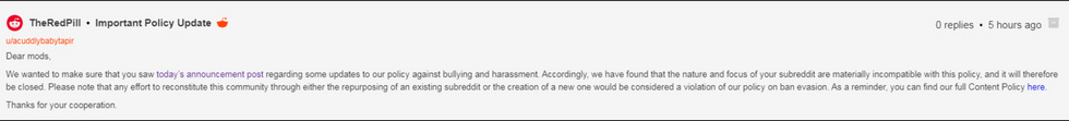 Expectedly, one of the first forums to be banned is the r/Braincels subreddit — which should have been kicked off a while ago as it was created as a replacement for r/incels after that forum was banned. It also includes r/TheRedPill, another misogynistic subreddit in which angry men sit around talking about how oppressed they are and how all women are evil and what have you. TRP hasn't been taken off the site yet, but the forum's moderators got notice yesterday that it soon will be.