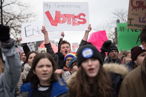 Today's the second major school walkout since the massacre at Marjory Stoneman Douglas High on February 14; this time, the walkout marks the 19th April 20 since the massacre at Columbine High School. The kids organizing the walkouts weren't even born when that happened, and the gun violence has just gone on and on. They're not only marching, though: They're registering young people to vote, or at least get it on their to-do list once they turn 18. The goal seems reasonable: Pass gun laws to reduce the number of iconic names of schools where kids were slaughtered.