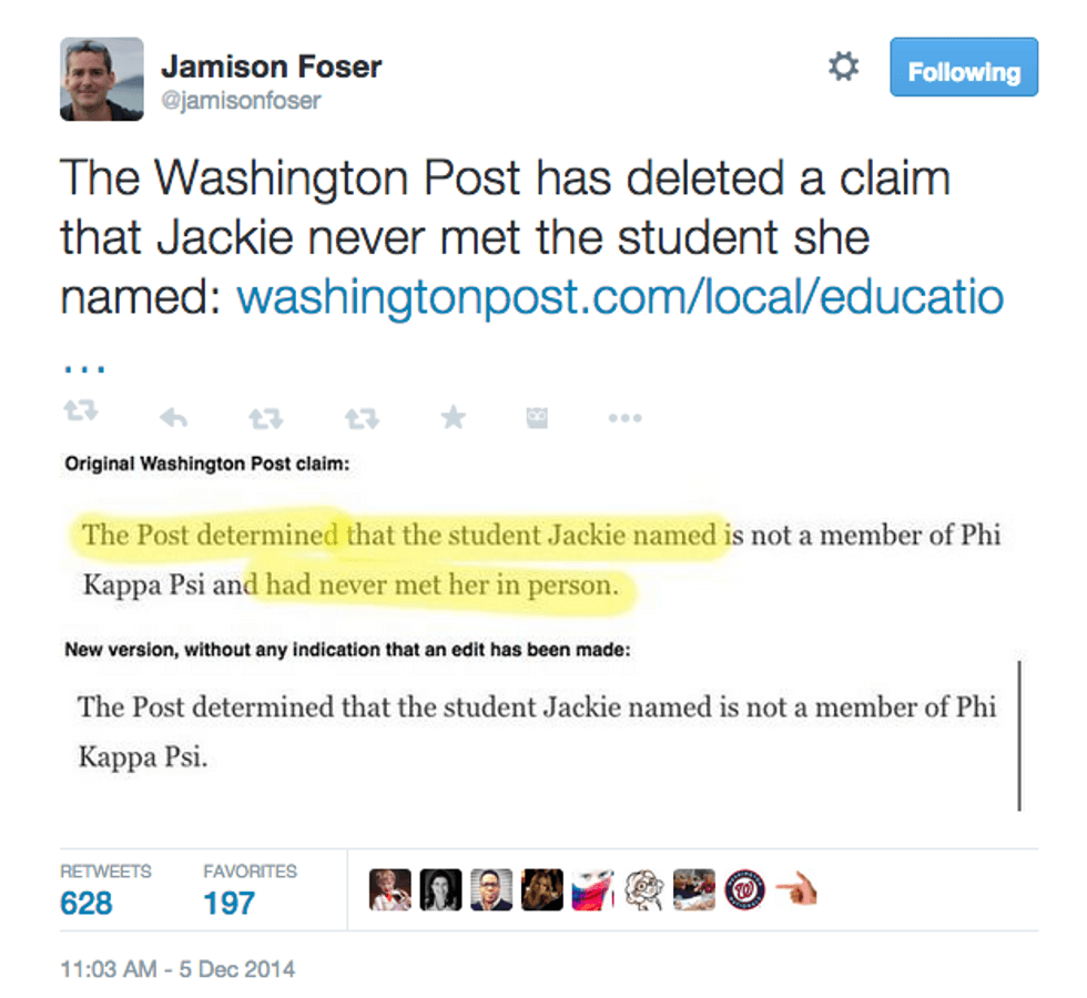 And Jackie's date, the one the Post had first "determined" had never met her, before quietly changing its sourcing to "he said" he'd never met her. He wasn't in Phi Kappa Psi. He was in a different fraternity. Therefore, it all never happened, because Jackie got the fraternity wrong.