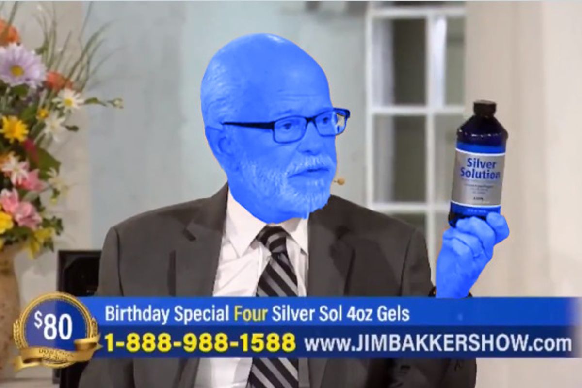 Jim Bakker, that old I Need Your Money For Jesus huckster who did a five-year stint in the federal slammer for fleecing his flock faithful, has been back on low-budget cable for a few years now, mostly selling nigh-inedible survival meal buckets to get you through the End Times and explaining that Planned Parenthood performs Satanic rites, free with every abortion. Ever the kind of fellow to hop on the latest trend, Bakker is now hawking a "silver solution" that just might cure the COVID-19 coronavirus, which now has an official name. Here's the spiel, as captured by the nice folks at Right Wing Watch.