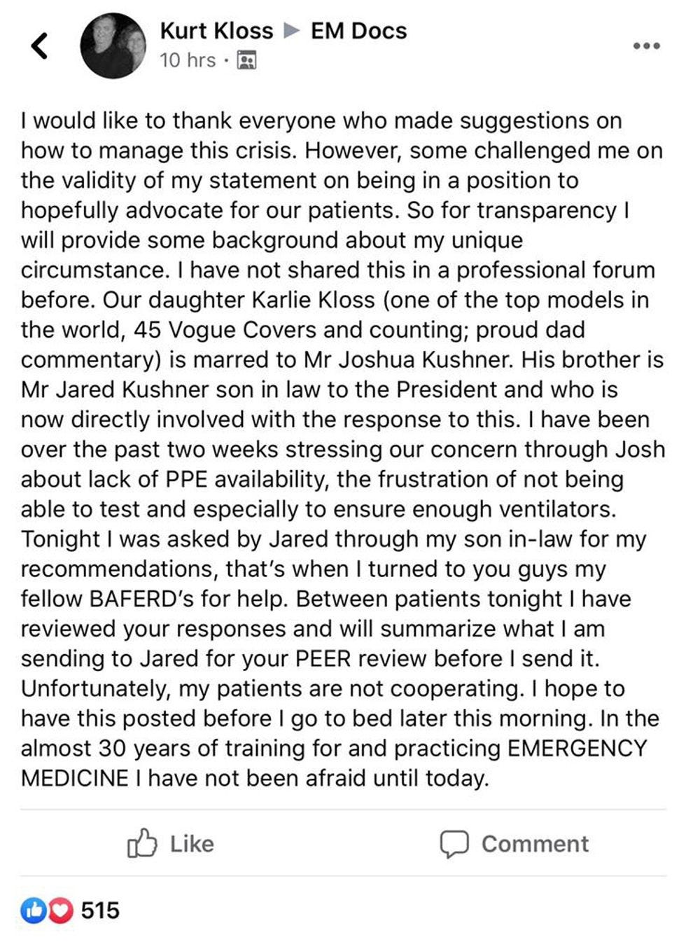 As the narrative in Politico starts, Dr. Kurt Kloss is on Facebook asking for advice on how to beat coronavirus. Thank goodness he is in a private Facebook group of ER doctors, and not, like, a group of "Gossip Girl" fans.