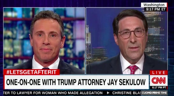 Talking hairpiece Jay Sekulow went on Chris Cuomo's CNN show Wednesday night to barf out the latest Trumpland nonsense on the Russian WITCH HUNT. Remember way back in May, 2017 when Donald Trump told Lester Holt about that hilarious time he fired James Comey to murder the Russia investigation?