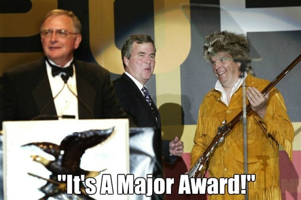 Just a few problems there: The NRA doesn't have any such award as "statesman of the year" at either the state or national level. And while Jeb did receive a flintlock rifle from the group when he was keynote speaker for its 2003 convention in Orlando, you might notice in the photo up there that it wasn't handed to him by Moses, or Ben Hur, or even by the guy who screamed that Soylent Green is people. Bush campaign communications director Tim Miller explained in a statement how Jeb got stuff all turned around in his head: