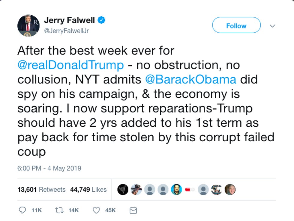Comedian Jerry Falwell Jr. Now Supports 'Reparations' For Former Slave Donald Trump