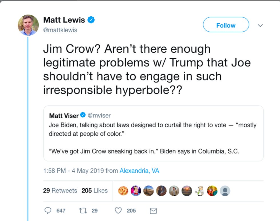 Speaking of which, this weekend at a campaign rally in Columbia, South Carolina , Joe Biden warned that "Jim Crow is sneaking back." He was calling out voter suppression efforts targeted "mostly at people of color," so he had a point based in observable reality. However, conservative pundit Matt Lewis thought he went too far. We're never supposed to compare bad things white people have done in the past to bad things white people are doing right now. That'll apparently only cause white working-class voters to "tune out" Democrats and vote for Trump again.