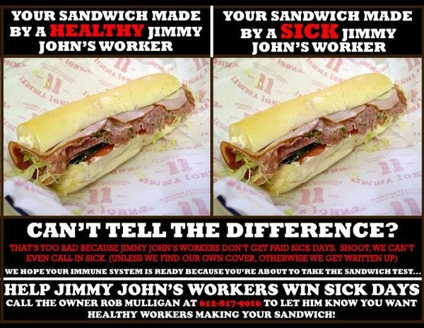 That decides us: No Jimmy Johns for us. They've got exactly the kinds of business practices that you'd expect from a company owned by a loathsome rightwing schmuck who, in addition to trying to snuff out unions, also delights in going on big game safaris and contributing buckets of money to Joe Goddamned Arpaio.