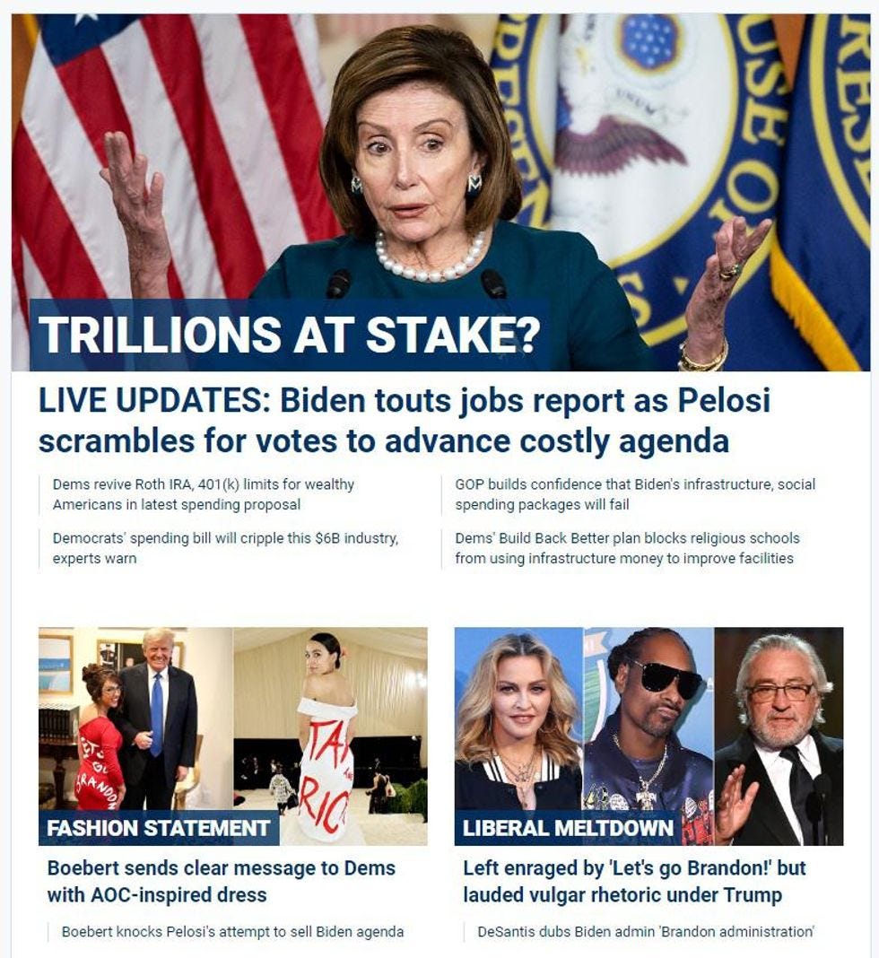 Also, the Fox News front page mentions the good jobs news, but tempers it with a complaint about the cost of Build Back Better, followed by two stories about "Let's go Brandon":