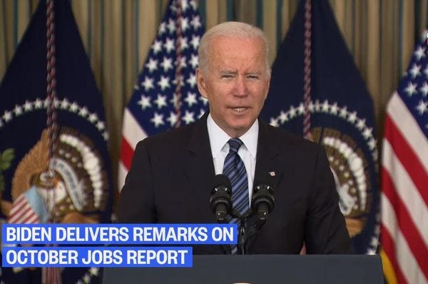 The continuing improvement in vaccination rates — 77 percent of eligible Americans have had at least one shot — is one reason for the improving jobs outlook, and Biden also touted this week's approval of the Pfizer vaccine for kids aged five to 11, which will make schools safer and also help family budgets since children who become magnetic after being vaccinated can help pick up loose change from sofa cushions. (No, do not complain in the comments that US coins don't react to magnets.)