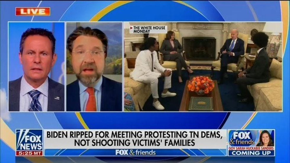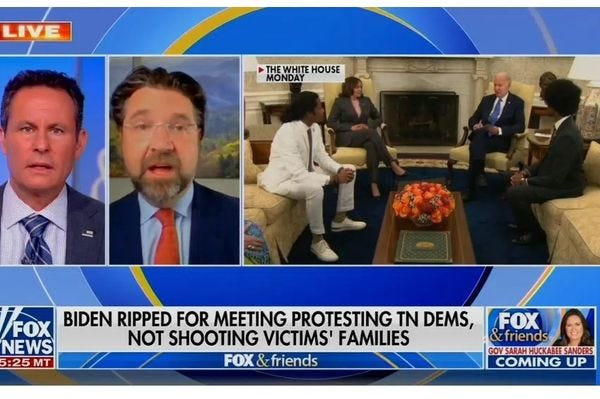 Also too, on Tuesday morning, Fox & Friends complained that Biden had met with the three legislators instead of with the families of the shooting victims, repeating the very same "eats shoots and leaves" headline — "Biden ripped for meeting protesting TN Dems, not shooting victims' families" — that appeared on an April 19 Fox News Digital piece. We're not sure whether the ambiguous headline was repeated as a chyron because nobody noticed the double meaning, or because some smartass in the Fox News editing booth thought it was hilariously terrible and wanted it to get more exposure.