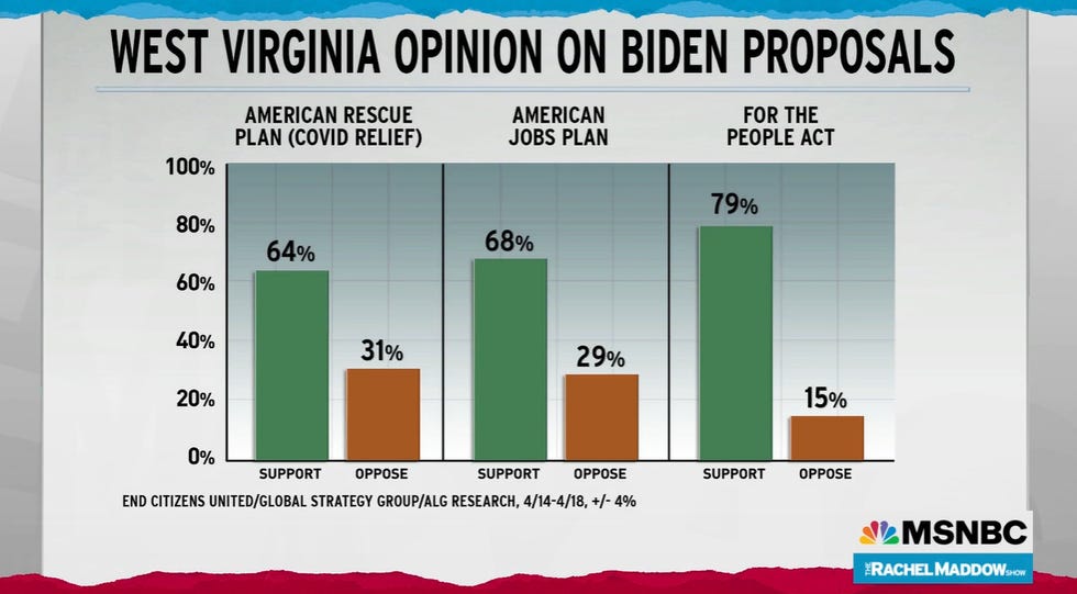 However, a poll last month from an advocacy group called End Citizens United (its name tells you what you need to know about it) shows that actually West Virginians don't hate what the Democrats are selling, AKA what Manchin is opposing. Here are a couple of screenshots from that poll from Rachel Maddow's show last night: