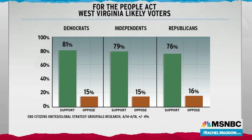 As you see in that frame, fully 79 PERCENT of West Virginians are just fine with the For The People Act. (The same poll found 84 percent of Arizonans support it too. Of course, Kyrsten Sinema is actually a co-sponsor of the bill, but that doesn't matter if she keeps clinging to the filibuster, KYRSTEN.)