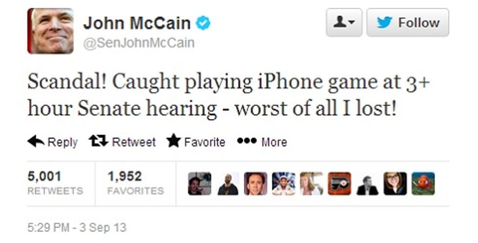 Remember that time John McCain went on all the teevees to yell about how we really needed to be having some very important classified meetings about BENGHAZI!!!!11!!1, at the exact same time some very important classified meetings about BENGHAZI!!!!!11!!1 were actually happening? Well, fool him once, won't get fooled again, because this time he actually showed up by God, just don't think that that meant he was going to, like, pay attention or something. Syria what now? Please, John McCain has gotten himself one of them crazy iphone thingies and man, there is POKER on there, and who cares about Syria any way????