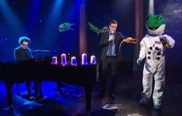 For a chaser, Oliver brings us a touching tribute to the Russian Space Geckos, which are now confirmed to have been lost in the service of science. They were sent into orbit to mate, but the satellite lost contact with home base, and the hapless fuck-lizards are now dead. Thankfully, after "five mournful flicks of the tongue," there's a song by band A Great Big World, and a ceremonial pouring-out of a 40.