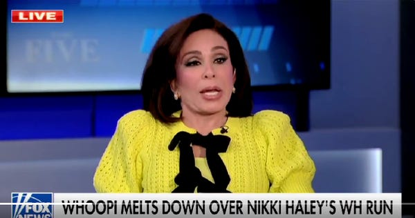 Yesterday afternoon, Judge Jeanine "Boxwine" Pirro and her friends sat around their big round table, like they do every day, and Boxwine shared some very important facts. They were talking about South Carolina, because Nikki Haley, and with a straight face she told her pals that "59 percent of the Black vote in South Carolina is Republican."