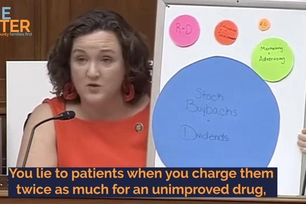 Rep. Katie Porter made another Pharma CEO sweat yesterday, during a House Oversight Committee hearing on prescription drug prices. Porter used her "whiteboard of justice" and a few sticky cutouts to dismantle a favorite excuse for high prescription drug pricing in the US: that we have to pay the highest prices in the world to ensure the companies can afford to do research and development of new lifesaving medical miracles. The reality, Porter pointed out, is that Big Pharma spends far more on advertising, executive pay, and enriching stockholders than on R&D.