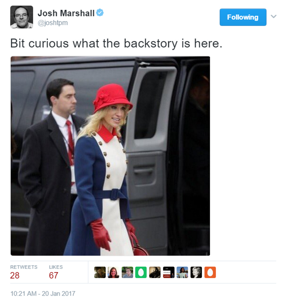 Anyway, all of Twitter and all of Facebook and all of the angels in heaven and demons in hell and the old witch who has Kellyanne Conway's father's soul trapped in a lantern -- read that link, The Onion is READY ON DAY ONE for the Trump regime -- laughed and laughed and started making up alternative facts about themselves, and Kellyanne Conway is the laughingstock of the universe now, even more than on Inauguration Day, when she wore that ... thing.