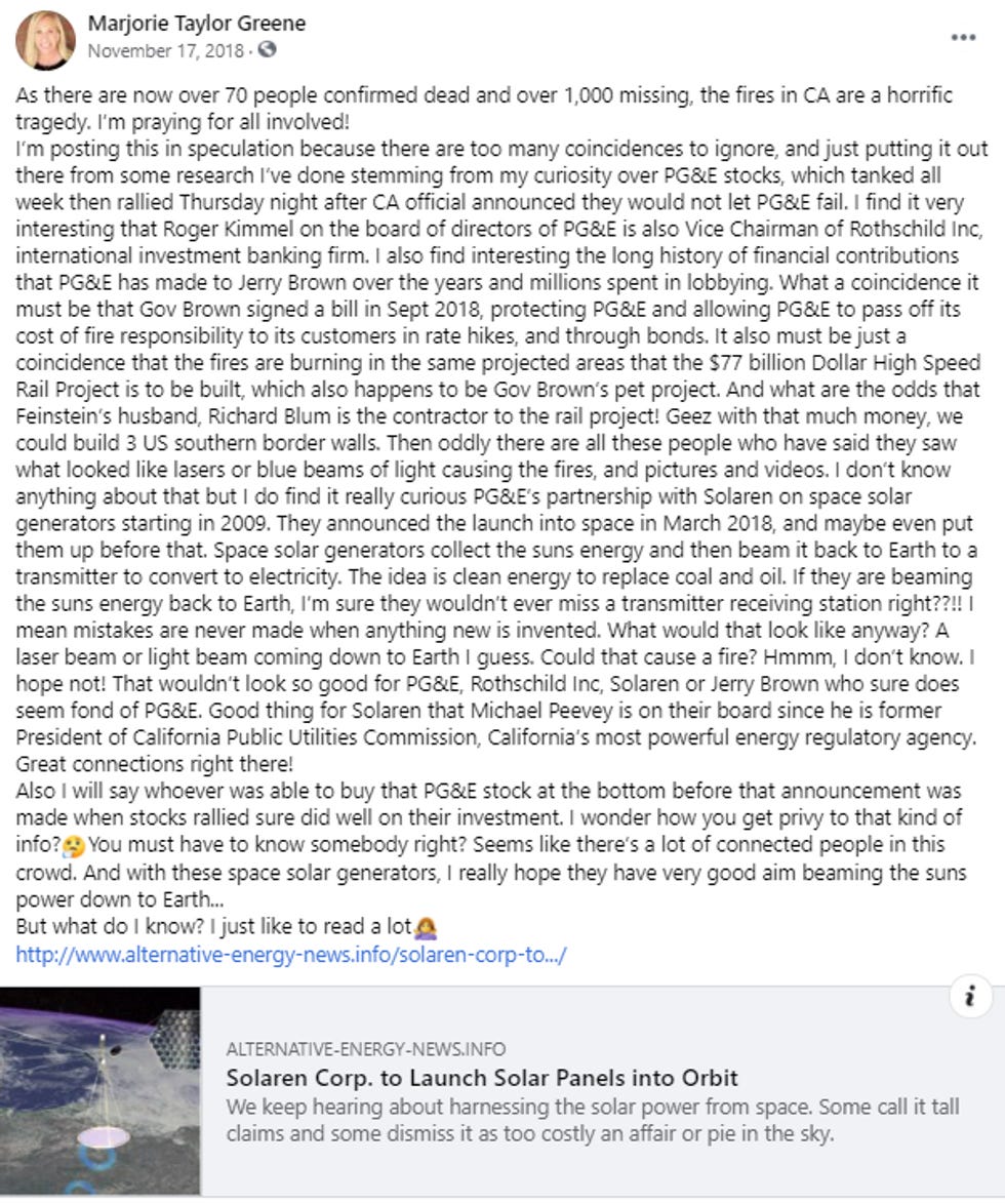 In November 2018, California was hit with the worst wildfire in the state's history. At the time, future Rep. Marjorie Taylor Greene (R-GA) wrote a bizarre Facebook post that echoed QAnon conspiracy theorists and falsely claimed that the real and hidden culprit behind the disaster was a laser from space triggered by some nefarious group of people.