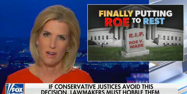 INGRAHAM: The left claims to care about democracy, so let's let the people decide the important questions presented by abortion and if a court with the majority of six Republican appointees fails to putRoe to rest, then it should expect a conservative-led movement to shrink the court's power. Oh, and it would also mean adios to The Federalist Society. And that's the angle.