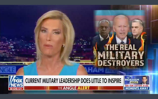 Last night, on her show on Fox News, Laura Ingraham blathered on about how military recruitment was suffering because all of the really cool macho guys who would join up are put off by general wokeness in the armed forces these days.